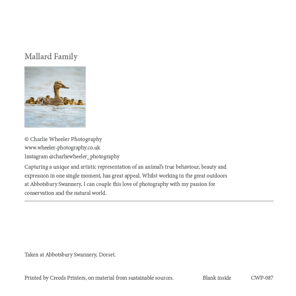Greeting card measuring 145mm x 145mm (210mm x 145mm unfolded). Blank inside. Watermark removed on printed product. All cards and envelope supplied in recyclable cellophane packaging.